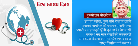 आज २५ चैत अर्थात् ७ अप्रिल, विश्व स्वास्थ्य दिवसको दिन हो । विश्वका अनेक राष्ट्रहरूले मानव स्वास्थ्यलाई मनन गरी विभिन्न सामाजिक संघ संगठनहरूले स्वास्थ्यसँग सम्बन्धित विचार गोष्ठी राख्ने, प्ले कार्डसहितको शहर परिक्रमा आदि कार्यक्रमको आयोजना गरी आ(आफ्नो किसिमले स्वास्थ्य दिवस मनाउने गर्दछन् ।