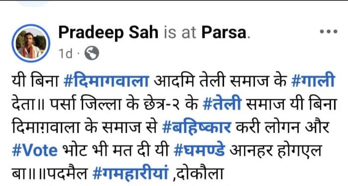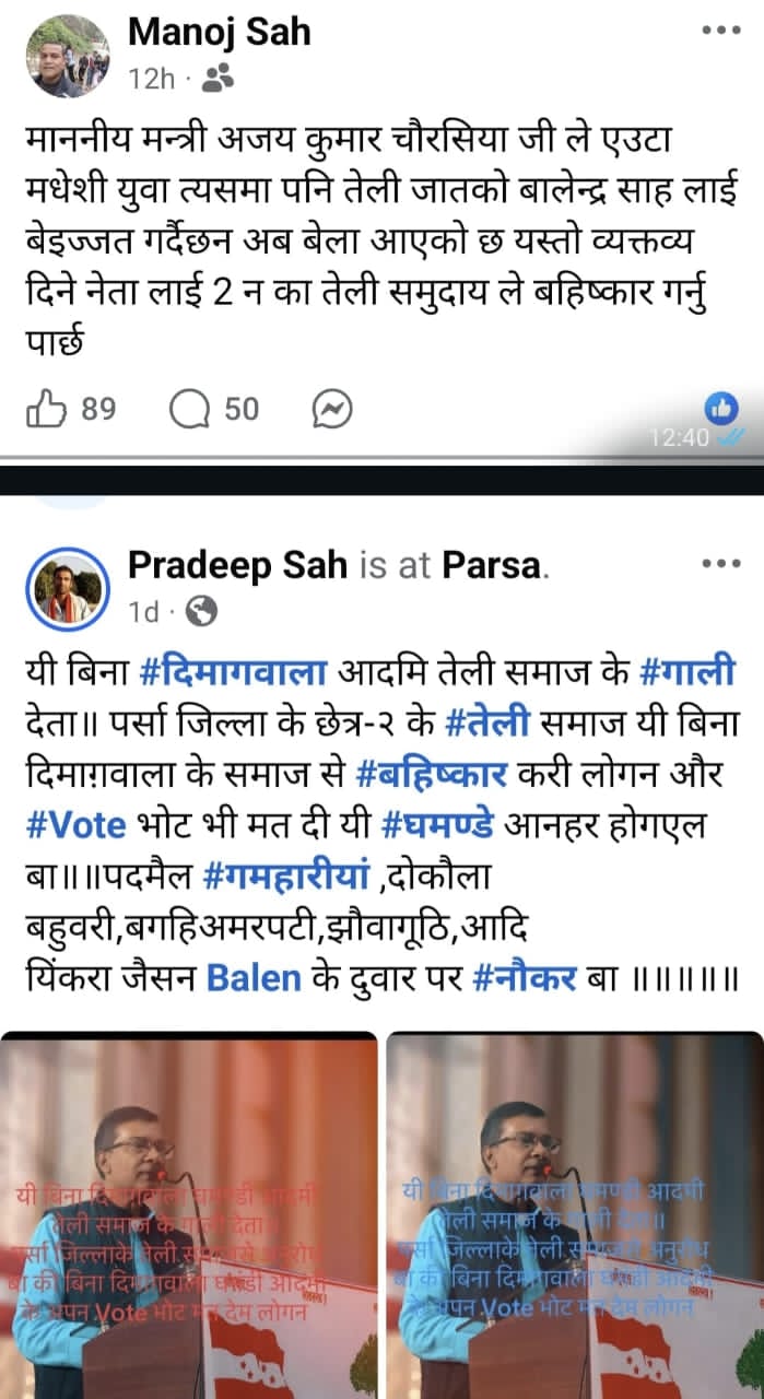 त्यस्तै अर्का तेली समाजका युवा मनोज शाहले सामाजिक सञ्जाल फेसबुकमा स्टाटस लेख्दै यस्ता गैरजिम्मेवार अभिव्यक्ति दिने नेताहरूलाई बहिष्कार गर्नुपर्ने धारणा व्यक्त गरेका छन्। उनले सार्वजनिक पदमा जाने आकांक्षा राख्ने व्यक्तिले समाजमा विभाजन ल्याउने होइन, एकता र सम्मानको सन्देश दिनुपर्ने उल्लेख गरेका छन्।