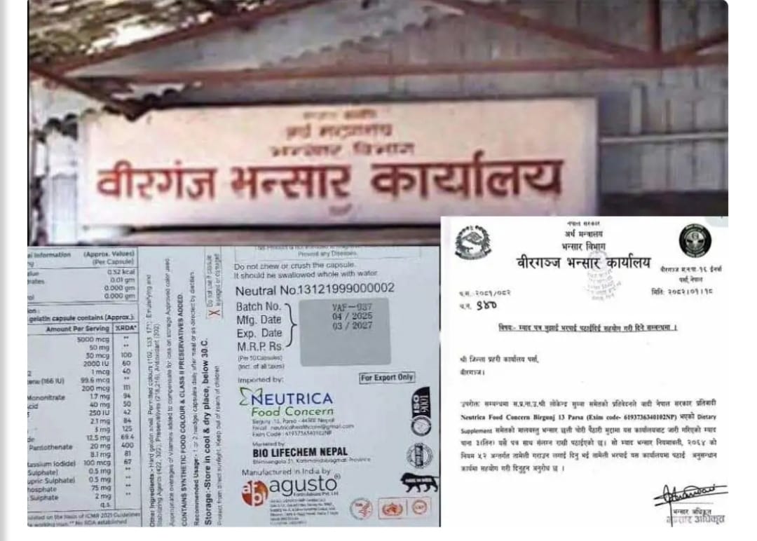 वीरगञ्ज, २३ जेठ – वीरगञ्ज नाकाबाट भन्सार छलि ल्याइएको करिब १०.५५ लाख रुपैयाँ बराबरको औषधिसहित अटो चालक अमृत साह कानु वैशाख १२ गते पक्राउ परे। उनका अनुसार उक्त तस्करीमा न्यूट्रिका फूड कन्सर्न र मंजु पटेल संलग्न छन्।