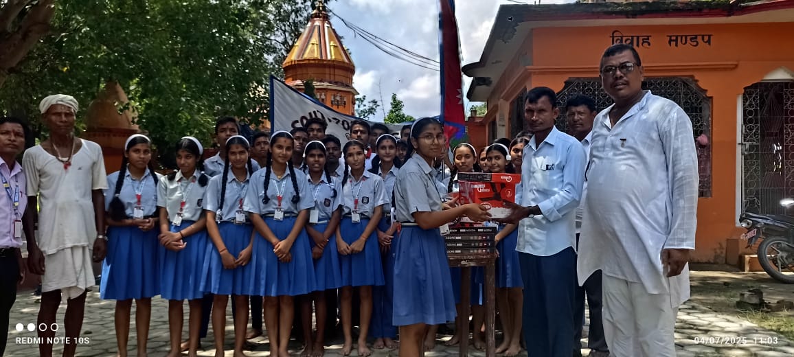 एक विशेष कार्यक्रममा कक्षाका शिक्षक अर्जुन चौधरीको अगुवाइमा विद्यार्थीहरूले मन्दिर संरक्षण समितिका सदस्य अनिरुद्ध प्रसाद महतो र पुजारी किशुन दासलाई फ्यान हस्तान्तरण गरेका हुन्।