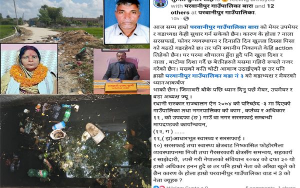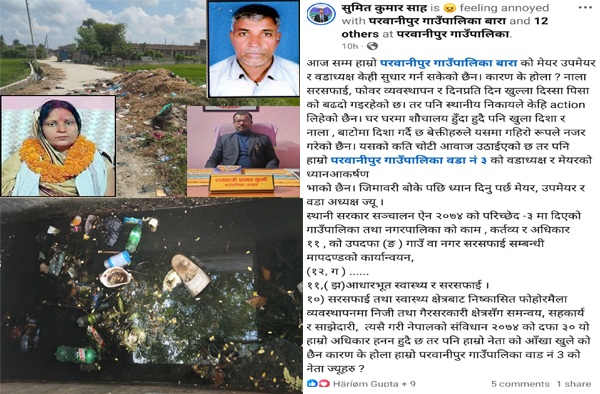 परवानीपुर गाउँपालिका–३ का स्थानीय युवा सोमित गुप्ताले आफ्नो सामाजिक सञ्जालमार्फत गाउँपालिकाका जनप्रतिनिधिप्रति आक्रोश व्यक्त गरेका छन्। उनले गा.पा अध्याक्ष रामक्षत्री प्रसाद कुर्मि, उपाध्यक्ष सुगान्धी देवी कनुइन र वडाध्यक्ष इब्रहिम मियाँ धोबीले अहिलेसम्म कुनै ठोस सुधारका पहल नगरेको भन्दै प्रश्न उठाएका छन्।