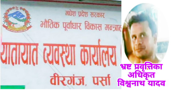 वीरगंज — छैठौं तहको अधिकृत भएर पनि करोडौं कमाएको आरोप खेपिरहेका वीरगंज यातायात व्यवस्था कार्यालयका विश्वनाथ यादव पछिल्लो समय घुस प्रकरण, शक्तिको दुरुपयोग र गुटबन्दीका कारण चर्चामा छन्। सेवाग्राहीहरूलाई झुलाएर, पैसा लिएपछि मात्रै काम गर्ने प्रवृत्तिका कारण यादवमाथि गम्भीर आरोप लाग्दै आएका छन्।