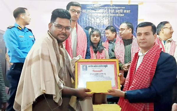 वीरगन्ज। वीरगन्जका पत्रकार स्व। नरेश सर्राफको स्मृतिमा स्थापना गरिएको ‘स्व।। नरेश सर्राफ स्मृति पत्रकारिता पुरस्कार’ यस वर्ष वीरगन्जकै युवा पत्रकार आंशु सर्राफलाई प्रदान गरिएको छ।