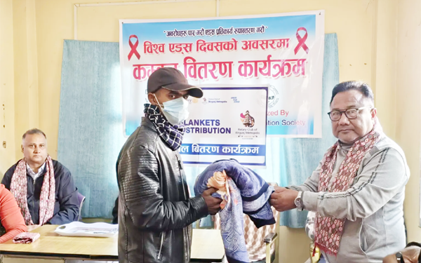 वीरगन्ज। विश्व एड्स दिवसको अवसरमा वीरगन्जमा एचआईभी एड्स संक्रमिततहरुलाई न्यानो कम्बल वितरण गरिएको छ ।रोटरी क्लब अफ वीरगन्ज मेट्रोपोलिसले आयोजना गरेको कार्यक्रममा एचआईभी एड्सबाट संक्रमित विपन्न व्याक्तिहरूलाई कम्बल वितरण गरिएको हो ।