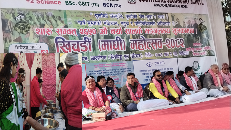 माघी (खिचडी) मूल समारोह समिति पर्सा, वीरगञ्जको आयोजनामा माघ १ गते थारु संवत् २६५० औँ नयाँ वर्षको शुभ अवसरमा आदर्शनगरस्थित स्विमिङ पुल परिसरमा खिचडी माघी महोत्सव आयोजना गरिएको थियो। महोत्सव मूल समारोह समिति वीरगञ्ज पर्साका कार्यक्रम संयोजक जङ्गबहादुर चौधरीको सभापतित्व तथा लक्ष्मीनारायण बन्ठाको प्रमुख आतिथ्यमा सम्पन्न भएको हो।