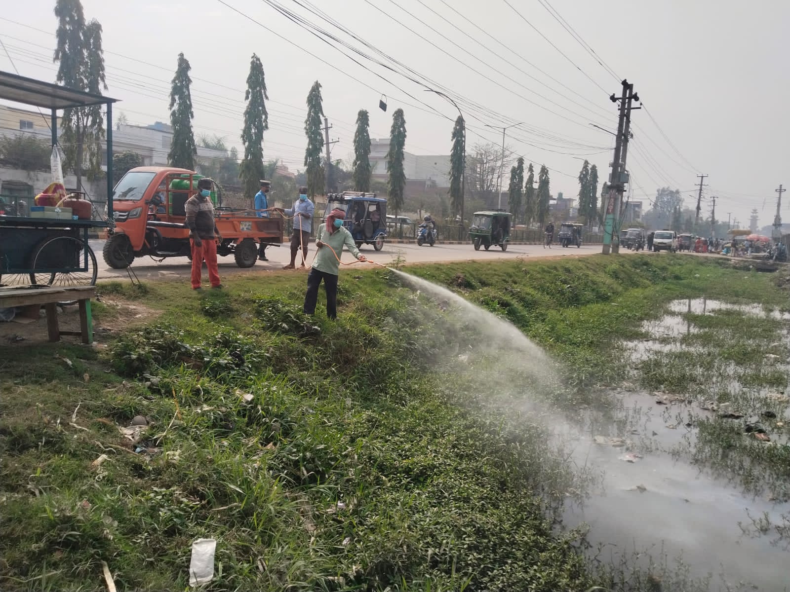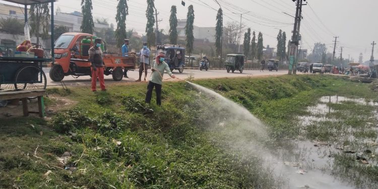 महानगर प्रमुखको निर्देशनअनुसार बिहान १० बजेदेखि विषादीयुक्त घोल तयार गरी नाला तथा पानी जम्ने स्थानहरूमा पम्प स्प्रे गरिएको सरसफाइ व्यवस्थापन शाखाका अधिकृत सरफुदिन मियाले जानकारी दिनुभयो।