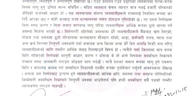 संघका अनुसार हाल प्राप्त जानकारीअनुसार देशका धेरै जिल्लामा मदिरा बिक्री वितरण फागुन १८ गतेदेखि मात्र बन्द गर्ने निर्णय गरिएको छ। तर पर्सा जिल्ला मा भने फरक र अगावैको मिति तोकिएपछि व्यवसायीहरू समस्यामा परेका छन्। एउटै देशभित्र एउटै प्रकृतिको व्यवसायमा फरक–फरक नियम लागू हुनु उपयुक्त नहुने संघको भनाइ छ।