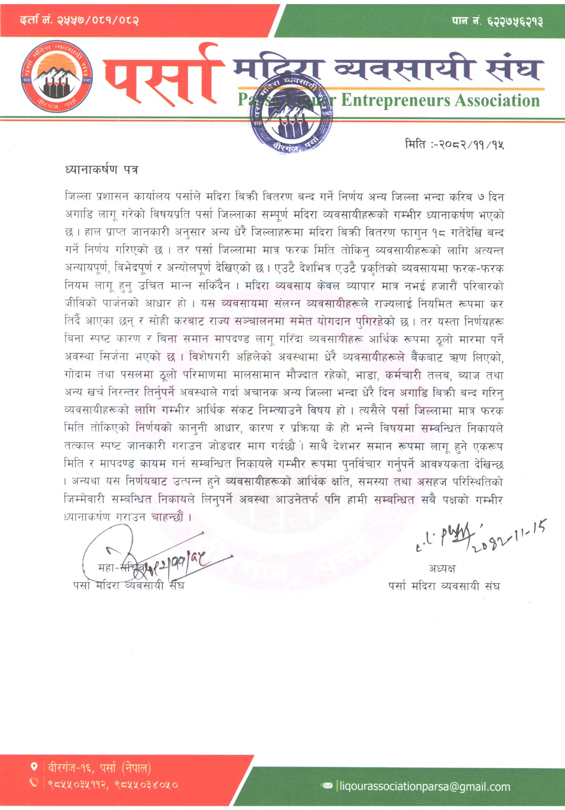 वीरगञ्ज । पर्सा मदिरा व्यवसायी संघ ले मदिरा बिक्री तथा वितरण बन्द गर्ने निर्णय अन्य जिल्लाभन्दा करिब सात दिन अगाडि लागू गरिएको भन्दै गम्भीर आपत्ति जनाएको छ। संघले यस विषयमा जिल्ला प्रशासन कार्यालय पर्सा को ध्यानाकर्षण गराउँदै निर्णयलाई अन्यायपूर्ण, विभेदपूर्ण र व्यवसायीहरूलाई अन्योलमा पार्ने खालको भएको जनाएको छ।