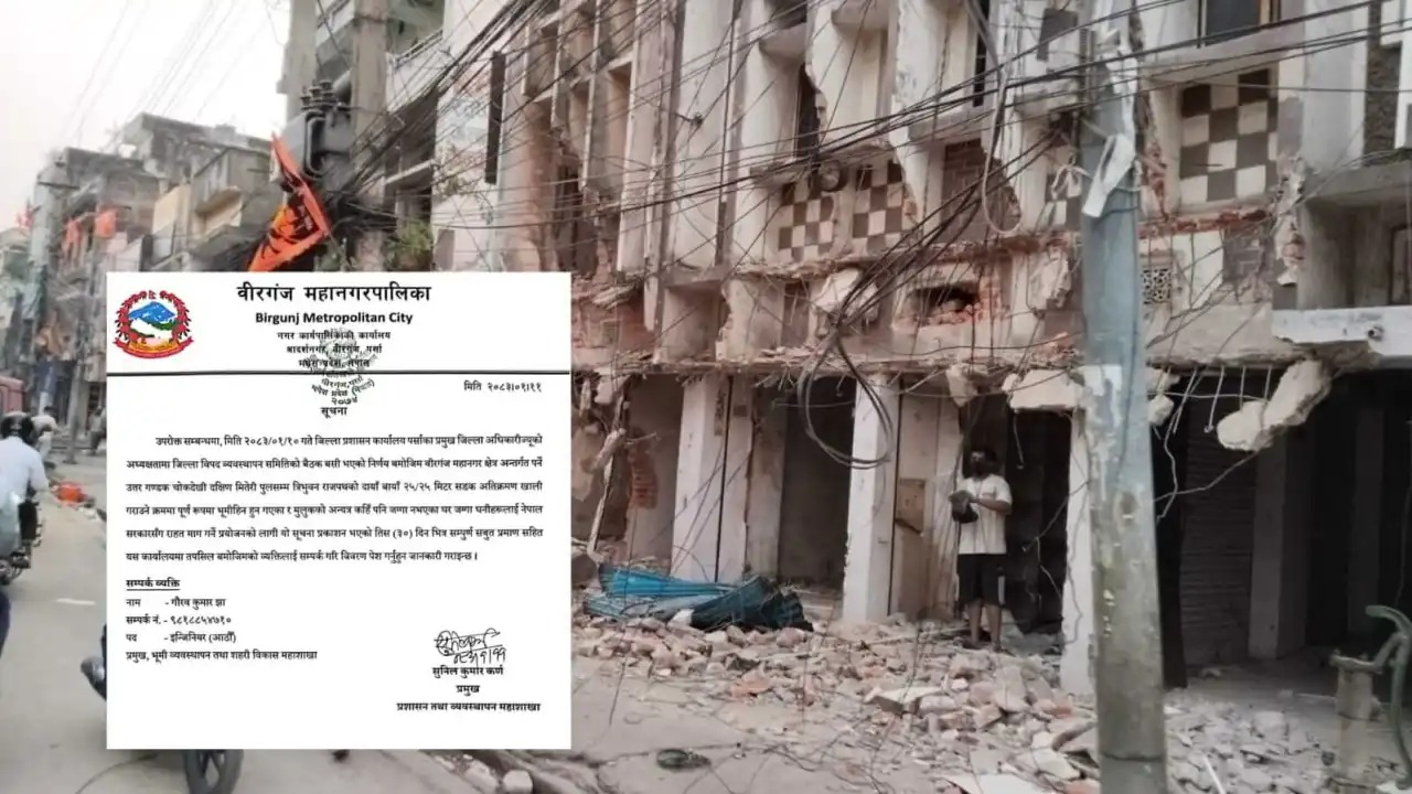 वीरगंज । पर्सा जिल्लाको वीरगंज महानगर क्षेत्रमा सडक विस्तार कार्यसँगै जोखिमपूर्ण अवस्थामा रहेका घर तथा टहरामा व्यापार सञ्चालन नगर्न जिल्ला प्रशासन कार्यालय पर्साले सर्वसाधारणलाई पुनः सचेत गराएको छ। प्रशासनले जारी गरेको सूचनामा यस्ता संरचनामा व्यवसाय गर्दा मानव जीवनमा गम्भीर खतरा उत्पन्न हुने भएकाले तत्काल त्यस्ता गतिविधि बन्द गर्न आग्रह गरिएको छ।