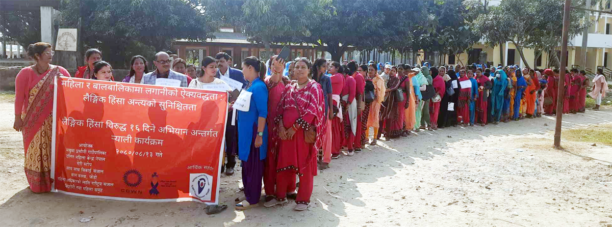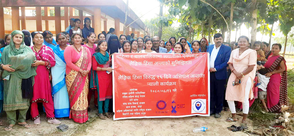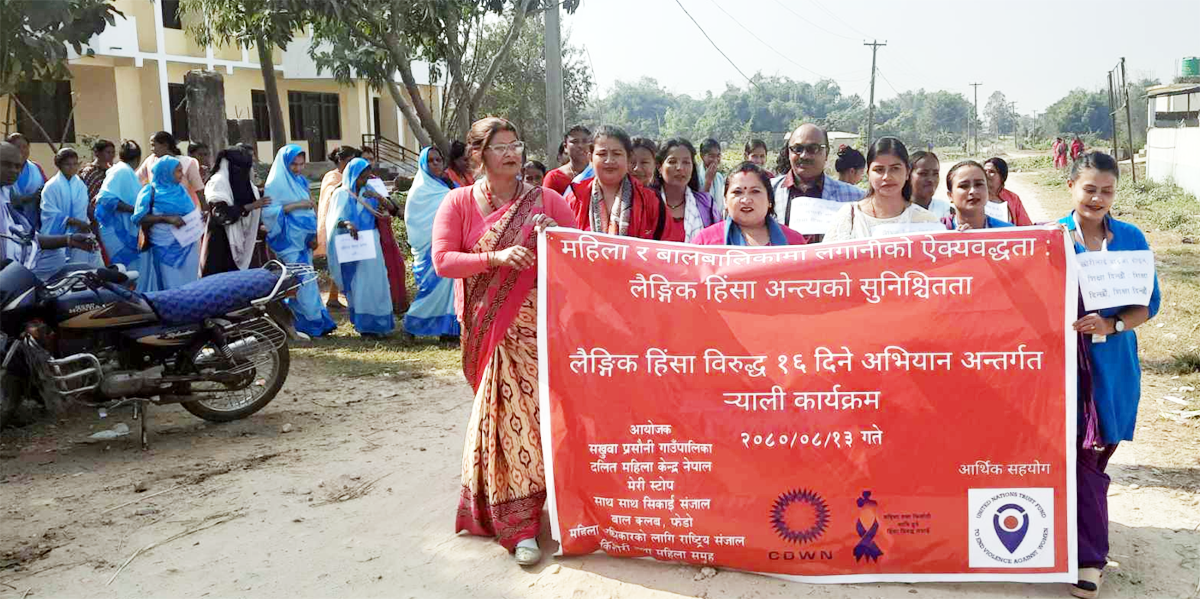 पछिल्लो समय हिंसाका घटनाहरूको अभिलेख बढेका कारण समाजमा जागरण ल्याउने उद्धेश्यले १६ दिने अभियान अन्तर्गत ¥याली निकालीएको दलित महिला केन्द्र नेपालकी मनोबिमर्स कर्ता निला रामले जानकारी दिनुभयो । रैयाली कार्यक्रममा निर्वाचित जनप्रतिनिधी,समाजिका अभियन्ता,शिक्षीका तथा स्वास्थ्य स्वयंसेवीकाको उपस्थीती रहेको थियो । कार्यक्रममा दुई सय जनाको सहभागीता रहेको थियो । कार्यक्रमको आयोजना सखुवा प्रसौनी गाउँपालिका ,दलित महिला केन्द्र नेपाल,मेरी स्टोप,साथ साथ सिकाई संजाल,बाल क्लब,फेडो,महिला अधिकारको लागी राष्ट्रि संजाल र किशोरी तथा महिला समुहले गरेका थिए ।