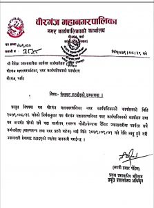 महानगरका प्रमुख प्रशासकीय अधिकृत लक्ष्मी प्रसाद पाैडेलकाे हस्ताक्षर रहेकाे उक्त सुचनामा महानगरपालिका कार्यापालिकाकाे मंसिर २६ गतेकाे निर्णय अनुसार महानगरपालिकाकाे कार्यालय, यस मातहतका सबै कार्यालय, स्वास्थ्य केन्द्र , स्वास्थ्य चाैकीमा दैनिक ज्यालादारीमा कार्यरत वारुणयन्त्र शाखा र नगर प्रहरी बाहेक अरु सबै कर्मचारीलाई पुस १ गतेबाट लागू हुने गरि ज्यालादारी सेवाबाट हटाइएकाे व्यवहाेरा उल्लेख छ ।